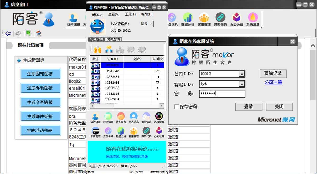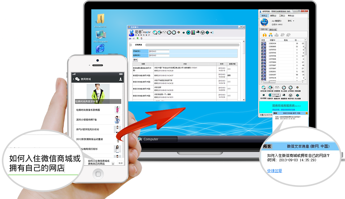 陌客mokor“訪客端”適應(yīng)于微信商城、小程序商城、H5商城、PC商城、APP商城,集成在商城里,訪客無需安裝任何軟件即可使用。 “客服端”支持所有的windows版本安裝。